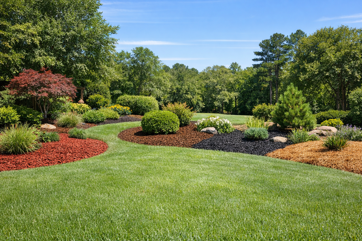 Mulch is a favorite for homeowners who want a crisp, finished look. It comes in colors like brown, black, and red, making it easy to match your home’s style.